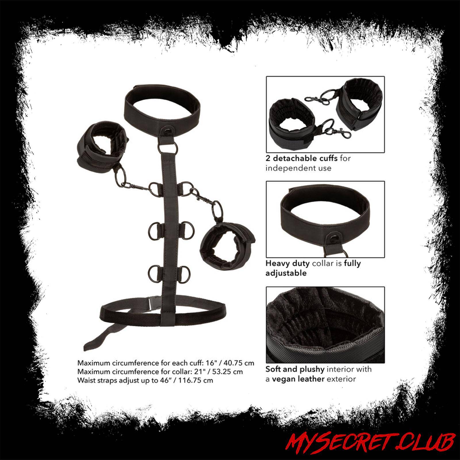 Slip into this daring restraint system and explore passionate play in the vegan leather universal cuffs, heavy-duty collar, and multi-level restraint tether. fetishists and bashful beginners alike can indulge in passionate pleasure play by slipping into the wickedly sexy restraints and padded faux leather cuffs.