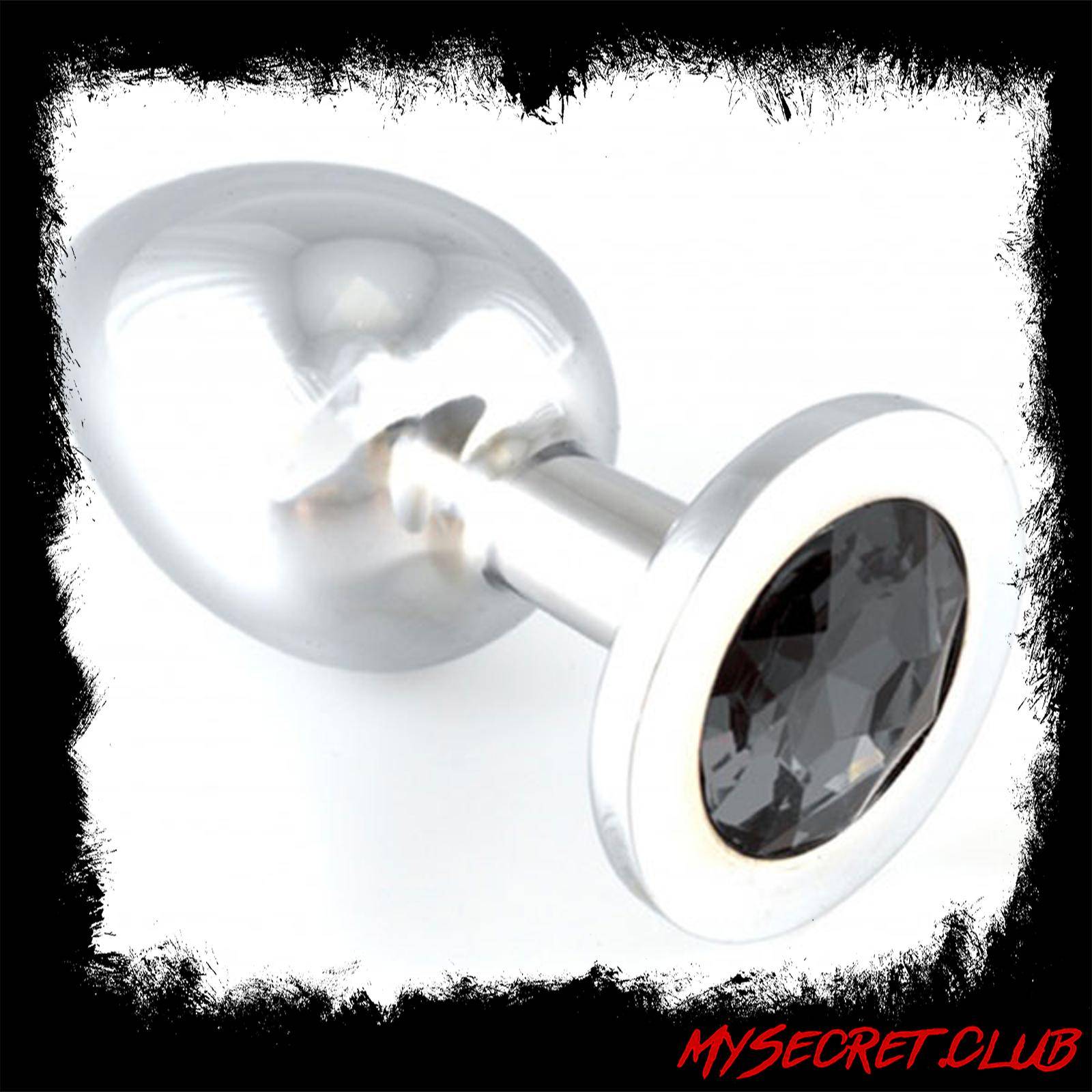 Large heavy smooth aluminium butt plug with a black crystal at the base to accentuate the bottom. Comes in a black presentation box.